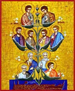 Martyrologe Romain : À Gortyne en Crète, l’an 250, dix saints martyrs durant la persécution de Dèce, repoussant publiquement l’ordre de sacrifier pour la dédicace du temple de la Fortune, ils furent torturés puis décapités.