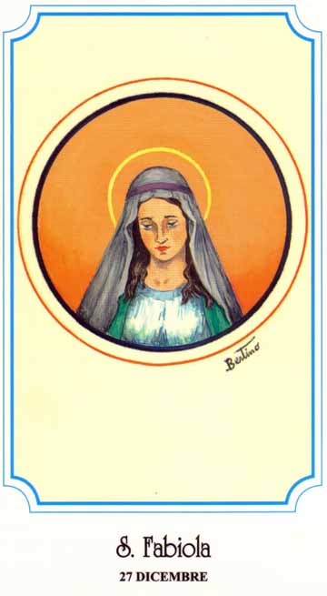 Martyrologe Romain : Commémoraison de sainte Fabiola, veuve romaine, qui, au témoignage de saint Jérôme, après divorce et remariage se soumit à la pénitence publique et la rendit parfaite pour le bénéfice des pauvres. Après plusieurs années passées en Terre sainte, elle mourut à Rome en 399, pauvre là où elle avait été riche.