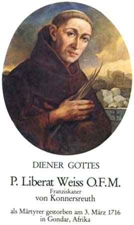 Martyrologe Romain : Près de Gondar en Éthiopie, l’an 1716, les bienheureux martyrs Libérat Weiss, Samuel Marzorati et Michel-Pie Fasoli, prêtres de l’Ordre des Mineurs, qui furent lapidés à cause de la foi catholique.