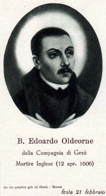 Martyrologe Romain : À Winchester, en Angleterre, l’an 1606, les bienheureux martyrs Edouard Oldcorne, prêtre, et Raoul Ashley, religieux de la Compagnie de Jésus, qui exercèrent leur ministère en cachette pendant de nombreuses années mais, accusés faussement de complot contre le roi Jacques Ier, ils furent mis en prison, torturés et enfin pendus et dépecés, alors qu’ils respiraient encore.